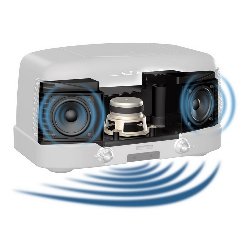 Интересной особенностью TEAC SL-D930, помимо дизайна, является встроенная аудиосистема. Она имеет конфигурацию 2.1 и состоит из двух 65-мм широкополосных динамиков, расположенных на передней панели под шикарными хромированными решетками, и 80-мм басовика, смонтированного в основании. Встроенные усилители работают в классе D, что обеспечивает высокую выходную мощность системы при небольшом тепловыделении и эффективном расходовании энергии блока питания. Каждый динамик системы получает сигнал от собственного усилителя.