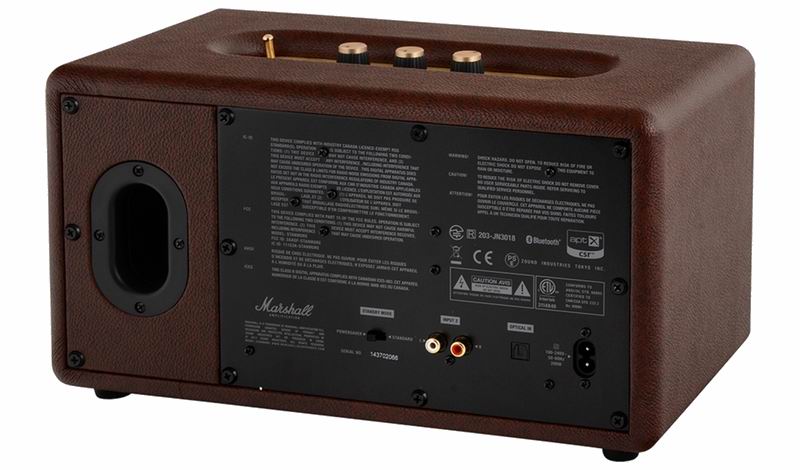 Каждая деталь Marshall Stanmore несёт в себе частичку олдскула: корпус обтянут винилом, на металлическую решетку динамика нанесён легендарный логотип, а ручки регулировок и аналоговые переключатели отделаны золотистым металлом.