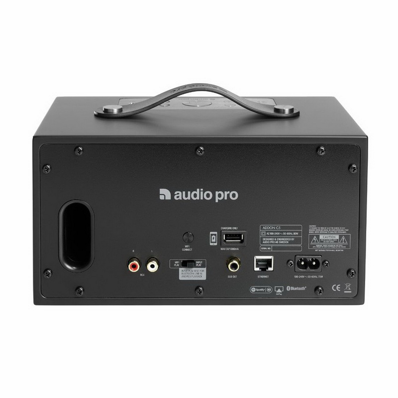 Audio Pro Addon C5 является активной акустической системой с беспроводным подключением Wi-Fi либо Bluetooth, а также несколькими физическими цифровыми и аналоговыми входами. Встроенные усилители в классе D общей мощностью 40 Ватт раскачивают два твитера с мягкими куполами диаметром 19 мм, а также основной СЧ/НЧ-динамик. Последний оснащен четырехдюймовым диффузором с длинным ходом и нагружен на фазоинвертор, щелевой порт которого находится на задней стенке. Там же расположены и все входы и выходы, а вот органы управления вынесены на верхнюю панель и сосредоточены на металлической площадке рядом с ручкой для переноски, выполненной из натуральной кожи. Корпус имеет гладкое матовое покрытие, на котором охотно отпечатываются пальцы владельца, поэтому переносить колонку нужно исключительно за ручку.