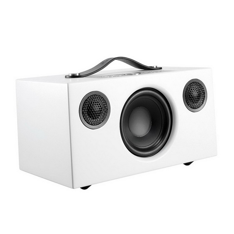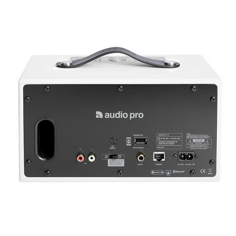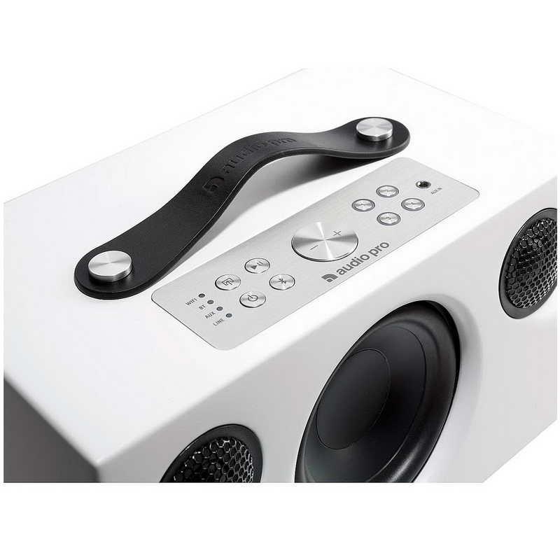 Audio Pro Addon C5 является активной акустической системой с беспроводным подключением Wi-Fi либо Bluetooth, а также несколькими физическими цифровыми и аналоговыми входами. Встроенные усилители в классе D общей мощностью 40 Ватт раскачивают два твитера с мягкими куполами диаметром 19 мм, а также основной СЧ/НЧ-динамик. Последний оснащен четырехдюймовым диффузором с длинным ходом и нагружен на фазоинвертор, щелевой порт которого находится на задней стенке. Там же расположены и все входы и выходы, а вот органы управления вынесены на верхнюю панель и сосредоточены на металлической площадке рядом с ручкой для переноски, выполненной из натуральной кожи. Корпус имеет гладкое матовое покрытие, на котором охотно отпечатываются пальцы владельца, поэтому переносить колонку нужно исключительно за ручку.