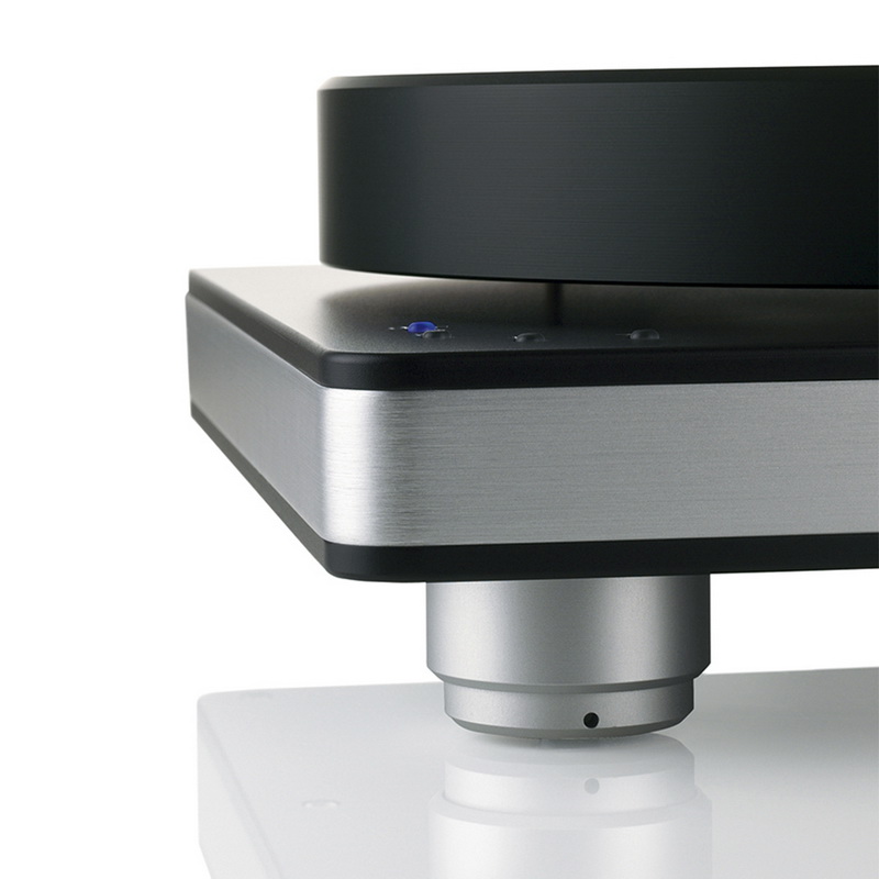 Мотор постоянного тока расположен непосредственно в корпусе. Его мощности вполне хватает для быстрого набора скорости. Более того, мотор снабжен системой автоматического контроля, но на случай необходимости имеется возможность регулировки — для этого на задней поверхности стола, поблизости от разъема блока питания установлены потенциометры. Непосредственно блок питания — выносной, в виде вилки-адаптера. Скорости у аппарата три, кроме привычных 33,3 и 45, есть еще 78-я скорость. Не совсем понятно, зачем именно она нужна, так как шеллачные пластинки требуют другого подхода, других головок, которые не особо-то просто и поставить на имеющийся тонарм, да и тонармы сами по себе нужны другие. Впрочем, к этому проигрывателю выпускается достаточное количество сменных баз — можно приобрести аппарат не как в нашем случае (в комплекте с головкой и тонармом), а просто взять стол с базой, например, под SME или Graham. Или с базой, которую можно просверлить самому. Она изготовлена из алюминия, достаточно массивная и сконструирована по уму — в столе просто имеется круглое отверстие, в которое помещается база, и фиксируется при помощи шести длинных винтов и металлического кольца с обратной стороны. Таким образом непосредственно к столу ничего не прикручивается, а возможное напряжение в металле не возникает за счет распределения нагрузки по кругу.