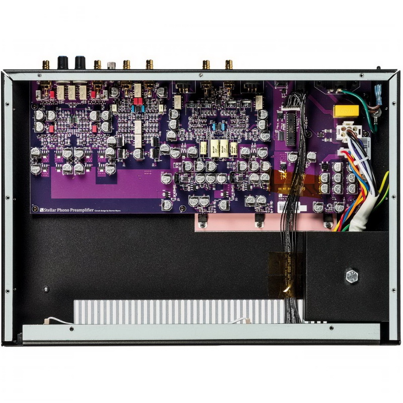 Модель PS Audio Stellar Phono имеет полностью дискретную конструкцию с балансной схемотехникой, которая предусматривает применение полевых транзисторов MOSFET и JFET нового поколения с низким уровнем шума и высокой перегрузочной способностью, работает в классе A и использует связь по постоянному току от входа до выхода для получения плотного собранного баса. Благодаря такому техническому решению удается получить показатель коэффициента усиления в 70 дБ с минимальным уровнем шума для головок звукоснимателя с подвижной катушкой, обладающих низким выходным напряжением в 0,15 мВ. В цепях задействованы тщательно подобранные комплектующие высокого класса, а на пути прохождения сигнала отсутствуют какие-либо микросхемы, что сделано специально с целью минимизации искажений. В аппарате применяется пассивная RIAA-коррекция. Также следует отметить наличие стабилизированного блока питания с мощным трансформатором и присутствие высокого напряжения в 20 В на выходе.