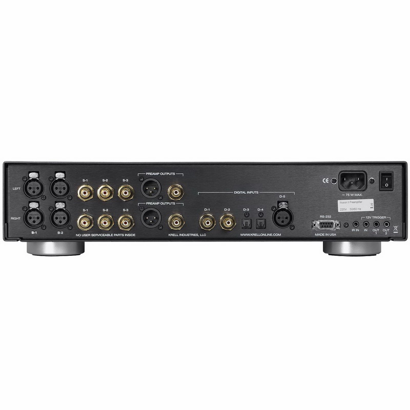Входы тыльной панели: два балансных XLR, 3 RCA, 2 оптических, 2 коаксиальных и AES/EBU (XLR). Выходы: балансный XLR и несимметричный RCA. Имеется интерфейс RS-232 для систем управления типа Crestron. Есть гнездо для ИК-приемника, а также триггерные вход и 2 выхода.