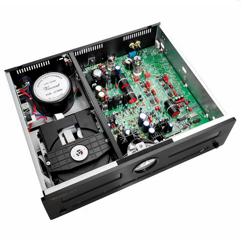 Транспортом служит Philips VAN 1202, примечательный долговечностью, невысоким уровнем шума и стабильной работой. Инженеры Vincent используют лампы не для красоты, а ставят именно туда, где их применение действительно оправданно. В проигрывателе Vincent CD-S7DAC на двойных триодах 12AX7 и 12AU7 построены балансные выходные каскады, что позволило получить низкий уровень шумов и искажений без введения глубокой обратной связи. Отдельная ламповая ступень предусмотрена для наушников.