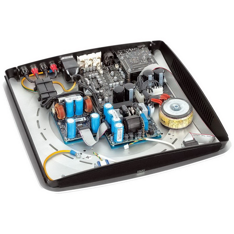 Разработчики не раскрывают, на какой элементной базе построен цифровой приёмник-коммутатор. Но, судя по всему, он наделён достаточно ёмкой буферной памятью и прецизионной системой тактовой синхронизации, которые гарантируют, согласно технической документации, джиттер не более одной пикосекунды, а это на слух практически нераспознаваемо. Далее звуковые данные направляются в фирменный процессор, получивший название Delta-SigMaster. В основе его лежит идея запатентованного Wadia алгоритма фильтрации Digimaster, но адаптированная под преобразование дельта/сигма. Заодно Delta-SigMaster осуществляет регулировку громкости без потери качества, а также апсэм-плинг данных до 1536 МГц, используя при этом 32-битовую FIR-фильтрацию. В аналог сигнал преобразовывается 32-битовыми чипами ESS 9018 SabreDAC. Об оконечной секции известно лишь то, что она работает в класе D+ и каждый канал отдаёт в четырёхомную нагрузку до 350 Вт.