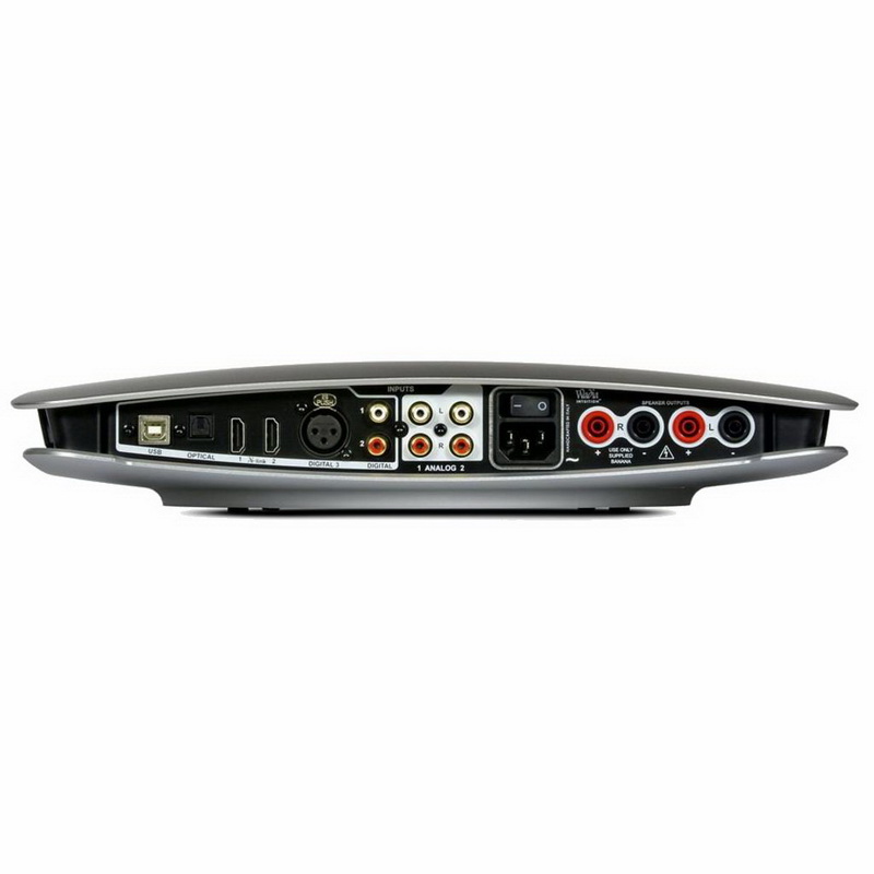 Разумеется, принадлежность усилителя Wadia Intuition 01 к отряду суперсовременной аппаратуры дизайном не ограничивается. Внешним тому подтверждением служит экипировка задней панели. Здесь расположены оптический и коаксиальный входы цифрового аудио, два линейных входа, порт USB В, а также реализованные на HDMI-разъемах два гнезда интерфейса Wadialink (I2S LVDS) для подключения родной аппаратуры (фирма обещает в скором времени выпустить оборудованный соответствующими выходами мультимедийный плеер). Не забыт и балансный вход AES/EBU. Зато на работу в локальной сети аппарат не рассчитан — гнездо LAN отсутствует.