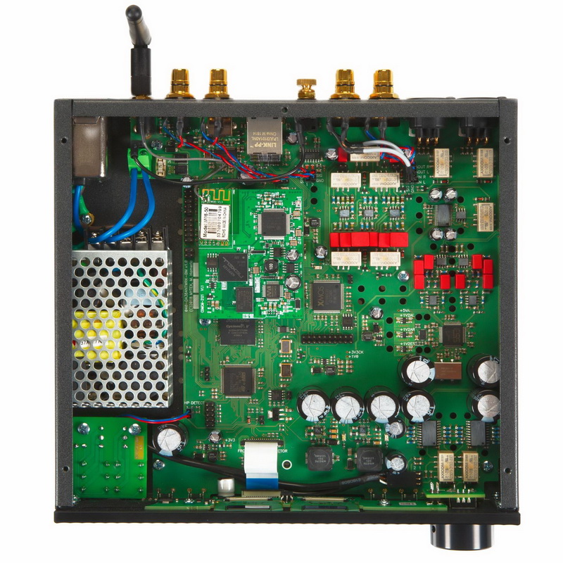 Вся информация выводится на двойной OLED-дисплей, требуемые режимы выбираются четырьмя кнопками, по две по сторонам от экранов, изменения режимов производятся «бесконечной» ручкой с нажатиями. Уровень выходного сигнала можно менять в цифровом и аналоговом виде, отдельно на выходах предусилителя и на усилителе для наушников. Можно выбрать режим линейного выхода (то есть, аппарат будет работать как чистый ЦАП), при этом регулировка громкости на наушниках будет сохраняться. Переключаться между режимами можно как вручную, так и автоматически, можно выбрать также одновременный вывод сигнала на наушники и на линейный/регулируемый выход. Для экрана существует режим скринсейвера, при этом выводится разрядность сигнала (цифрами и графически в виде некоей шкалы) и уровня выхода (в таком же стиле).