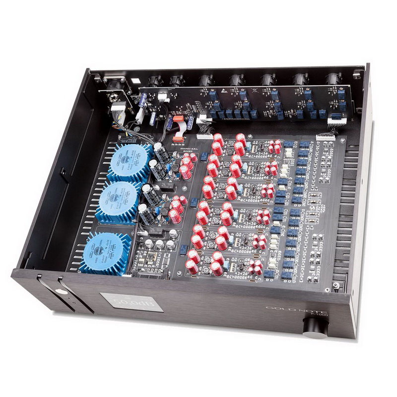 Предусилитель Gold Note P-1000 оснащен эксклюзивным релейно-резисторным регулятором громкости с 256 шагами, гарантирующим наилучшие характеристики звука, практически исключая искажения в тракте аудиосигнала.
