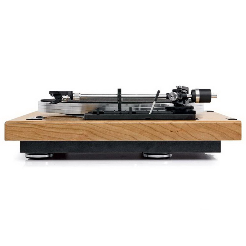Основной диск проигрывателя легкий, но не самой обычной конструкции. Он состоит из нескольких алюминиевых деталей, скрепленных между собой через демпфирующую вставку. Что именно за материал там использован, не разобрав диск, понять сложно, но по характеристикам получается следующее – диск не тяжелый и совсем не звонкий, но и не глухой. Он оставляет ощущение некоей более-менее нейтральной в резонансном отношении конструкции. К диску прилагается фетровый мат средней толщины. Мотор постоянного тока небольшой мощности, с выносным блоком питания в виде вилки-адаптера. Управление мотором очень простое и всё также смонтировано на основном металлическом шасси.