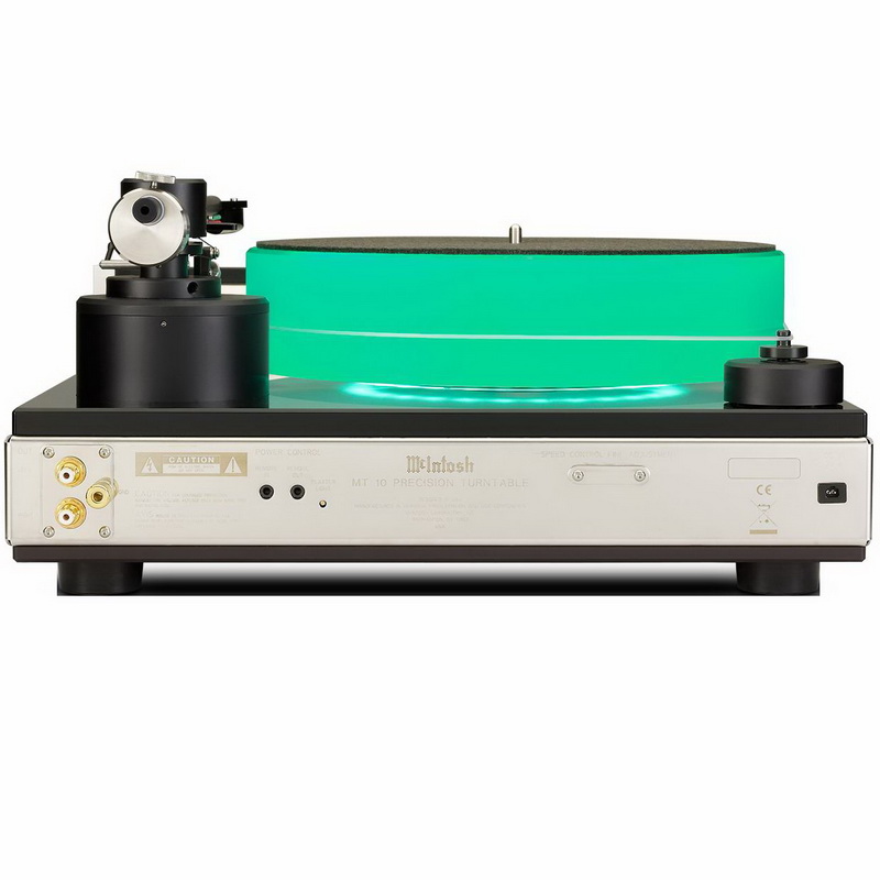Проигрыватель McIntosh MT10 получил массивный опорный диск с внутренней подсветкой зеленого цвета, вес которого превышает 5 кг, а высота равна 64 мм. Диск изготовлен из специального акрила (силикон/акрил) на станке с ЧПУ и посажен на керамический подшипник с мощной магнитной подвеской, обеспечивающей плавное вращение с минимумом трения. Его раскручивание происходит с помощью пассикового привода и высокоточного бесщеточного электромотора постоянного тока швейцарского производства. Питание подается от внешнего адаптера.