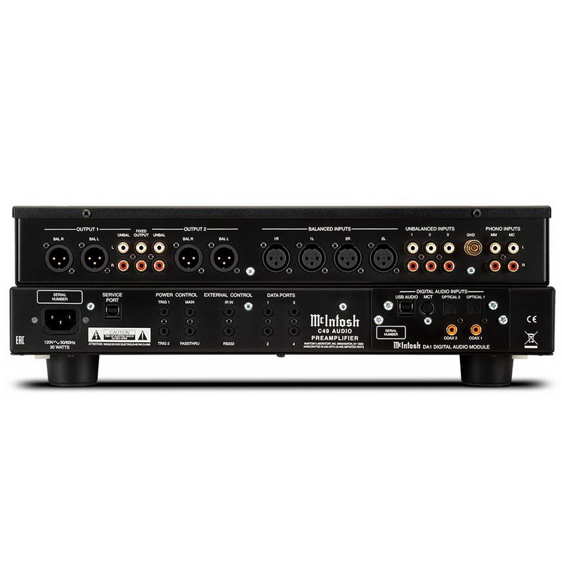 Предварительный усилитель McIntosh C49 выполнен в классическом дизайне: черное стекло со вставками из полированного алюминия, экран с синей подсветкой и мерцающий зеленым цветом логотип. На борту новинки находится цифровой модуль DA1, обеспечивающий цифровое подключение предусилителя, причем со временем его можно будет заменить на более современный.