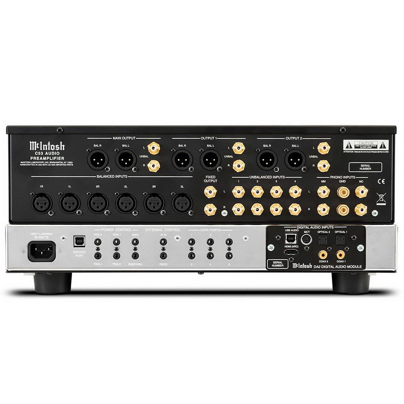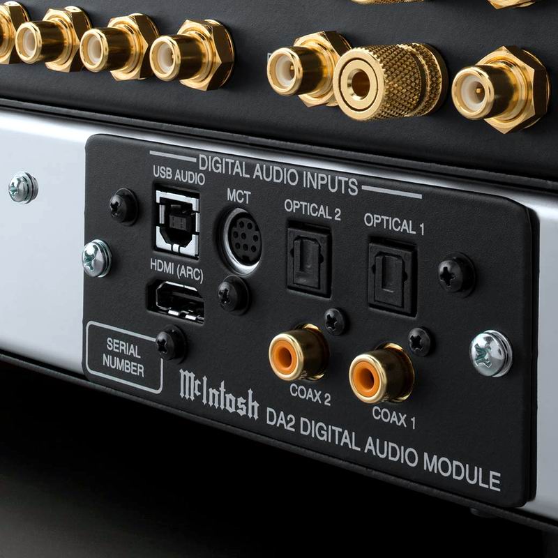 Поначалу компания использовала модуль DA1 (Digital Audio Module 1), но теперь выпустила предусилитель McIntosh C53, в который сразу же установила вторую версию этого модуля. У него больше разъемов: плюсом к двум коаксиальным, двум оптическим, одному USB и одному проприетарному MCT модуль получил еще и HDMI для передачи аудио. Теперь устройство с таким модулем можно подключить к телевизору с выходом HDMI ARC и наслаждаться фирменным звуком McIntosh. Модуль умеет декодировать популярные форматы от Dolby и DTS и преобразовывать их в стерео. Также по USB теперь модуль принимает не DSD256, а DSD512 — все благодаря новому восьмиканальному 32-битному ЦАПу с архитектурой Quad Balanced. Есть и поддержка DSD до 384 кГц.