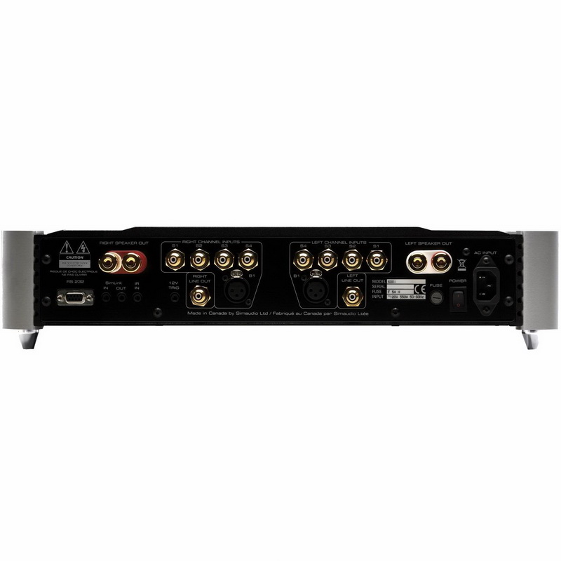 Справа на передней панели усилителя находятся кнопки с необычными для усилителя названиями Setup и OK. Они позволяют озаглавить каждый вход, установить максимальный уровень громкости или уровень смещения для каждого источника. Также можно сделать тот или иной вход нерегулируемым для работы в многоканальной системе домашнего кинотеатра, когда громкость регулирует AV-процессор, или вовсе отключить его. По плотности и разнообразию портов, населяющих заднюю стенку, шестисотый не уступит иному AV-ресиверу. Помимо четырех несимметричных входов здесь найдутся балансный вход, несимметричный линейный выход (его можно сделать нерегулируемым), вход/выход фирменной управляющей шины SimLink, а также вход для внешнего ИК-приемника и выход триггера 12 В, позволяющий при включении/выключении усилителя переводить соответственно в рабочий или спящий режим другую аппаратуру. Также имеется порт RS-232 для того, чтобы вписать усилитель в многоканальную систему управления.