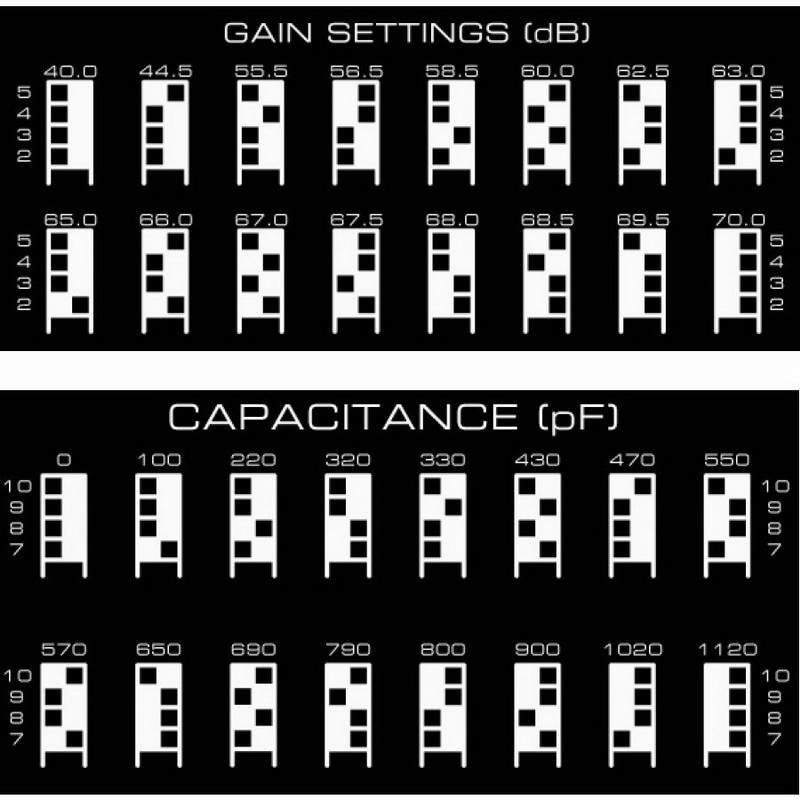 В плане настроек SimAudio Moon Evo 810LP под различные головки возможности корректора откровенно удивляют — такого их количества я почти нигде не встречал. 16 значений коэффициента усиления, 16 значений емкости, 64 значения сопротивления и выбор между кривыми RIAA и IEC. И все это независимо для каждого канала, учитывая, что аппарат построен по схеме «двойное моно». Имея возможность оперировать значениями во всем диапазоне и с малым шагом, подобрать параметры и настроить звук можно для абсолютно любой головки звукоснимателя. Но если рассмотреть все эти возможности с практической точки зрения, своя ложка дегтя найдется. Блоки переключателей для настройки находятся на нижней поверхности корпуса. Чтобы сделать максимально точную настройку сначала по паспортным данным головки, а потом и на слух, мне пришлось поместить корректор в стойку, положив его вверх ногами.
