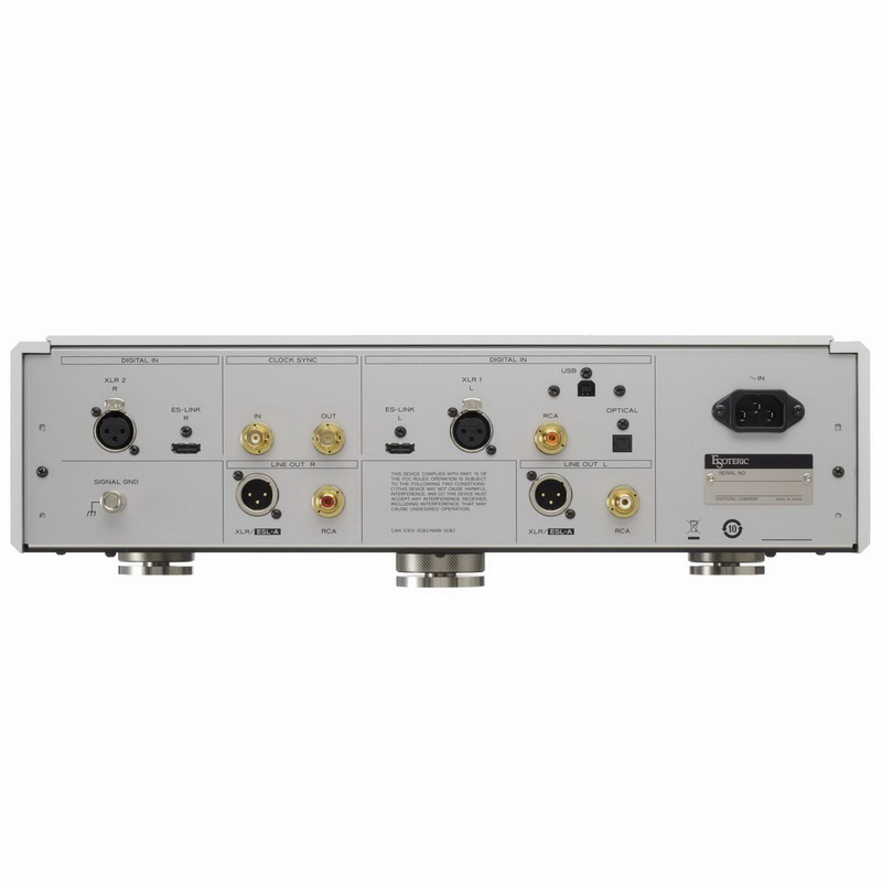 Коаксиальный и оптический входы Esoteric D-05X поддерживают PCM сигналы с разрешением до 24-бит/192кГц и 2.8MГц DSD (DoP). Два XLR входа поддерживают 48-бит/192кГц (ES-LINK3), 24-бит/384кГц (Dual AES 8Fs) и 5.6MГц DSD (DoP и Dual XLR mode).
