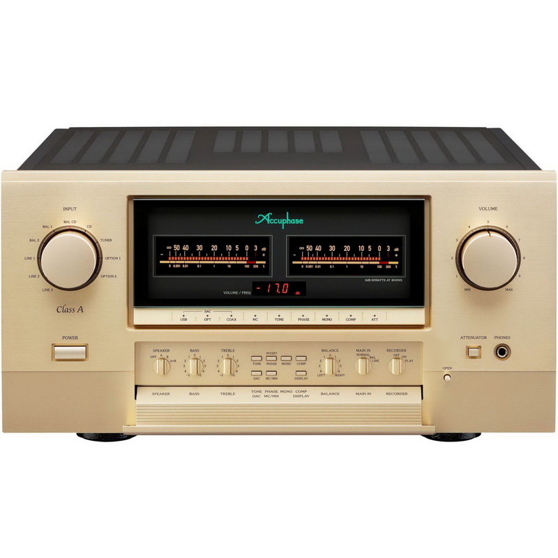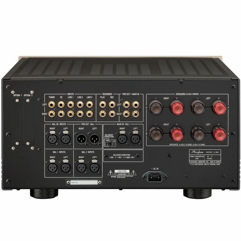 Красивые цифровые жидкокристаллические индикаторы завораживающе двигаются в такт музыке. В позолоченные высококачественные акустические разъёмы вы можете подключать кабели с разъёмами типа "лопатка". Accuphase E 800 это многофункциональный и широко оснащённый аппарат имеющий : Регулировку тембра и баланса, отключаемую тонкомпенсацию, включение и переключение двух пар акустики, высококачественный регулируемый выход на наушники, встраиваемый модуль с цифро-аналоговым преобразователем, встраиваемый модуль с ММ/МС фонокорректором, переключатель фазы сигнала на балансном входе (на задней панели усилителя).