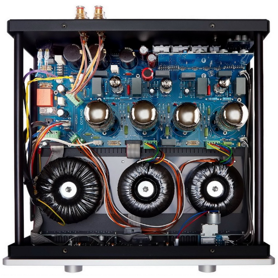 В качестве выходных ламп усилитель Copland CTA407 позволяет использовать любые модели семейства 6550/KT88/KT120/KT150 – фирменная система автоматической регулировки смещения без потерь определит оптимальный режим работы выбранных ламп. Поставляется Copland CTA407 с лампами KT88 в выходных каскадах, двумя двойными триодами 12BH7 и одним двойным триодом ECC83 в каскадах предварительного усиления. Все трансформаторы в усилителе (силовой и два выходных) – тороидальные, собственного производства.