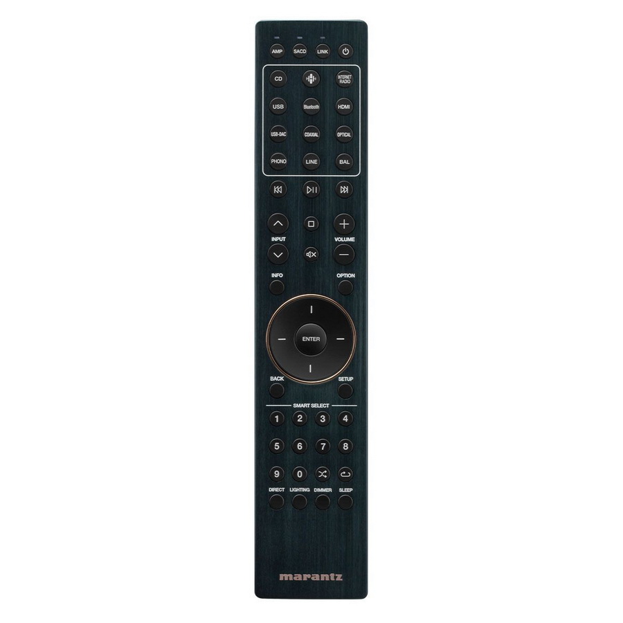 Как будто массивной алюминиевой передней панели было недостаточно, Marantz добавила еще одну, чуть меньшую панель перед ней, где размещены элементы управления. К ним относятся круглый TFT-дисплей высокого разрешения, а слева и справа от него — две поворотные ручки, которые работают без люфта благодаря прецизионным шарикоподшипникам. Левая ручка выбирает вход, правая — громкость, каждая из которых отображается текстом и графикой на дисплее. Вот и все, что представляет собой это устройство.