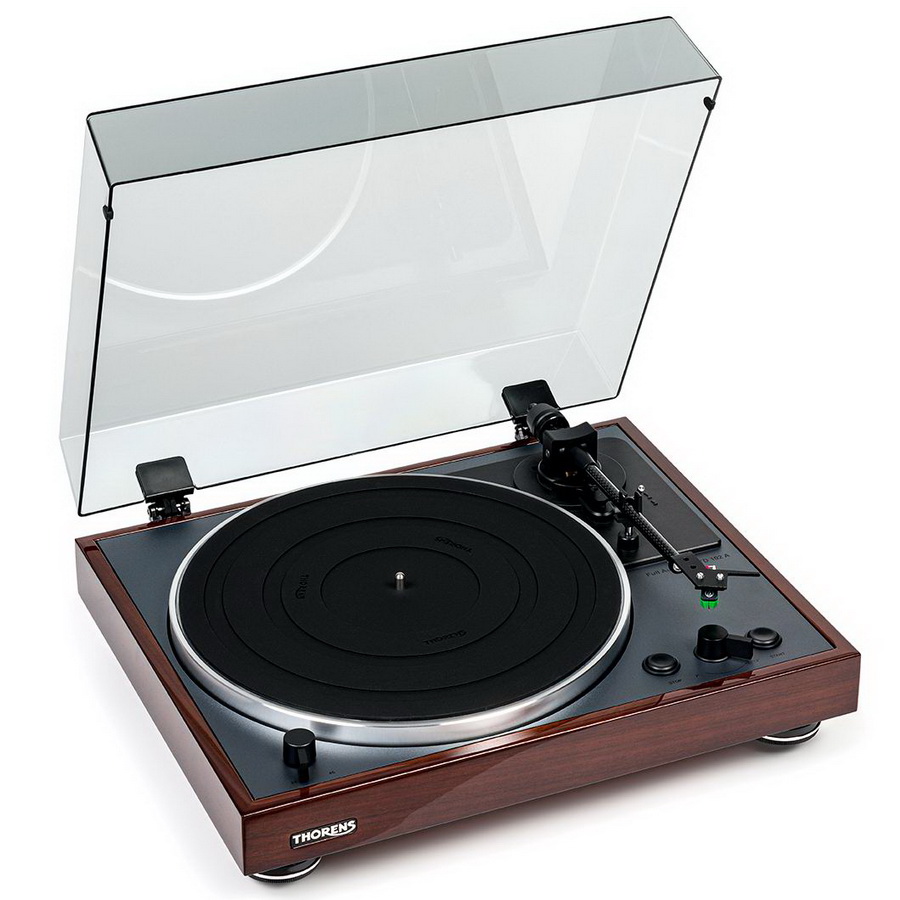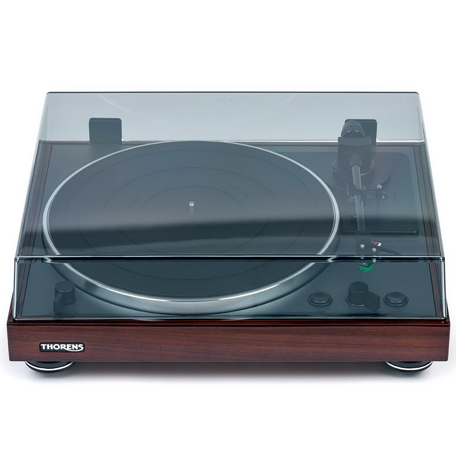 Опорный стол вертушки изготовлен из плиты МДФ повышенной плотности. Материал предельно жесткий, с отличными акустическими характеристиками. Кроме этого, стол из МДФ красиво смотрится, придавая внешнему виду проигрывателя особый шарм. Проигрыватель поставляется в двух вариантах отделки корпуса – черный глянец и ореховый шпон. Звучание проигрывателя характеризуется ровной подачей во всем среднечастотном диапазоне с максимальной детальностью и артикуляцией. Локализация источников и их позиционирование в пространстве в общей картине вполне реалистичными и осязаемы. Характер звучания может быть охарактеризован как нейтральный без подчеркивания какого-либо диапазона и может быть рекомендован как универсальный, не имеющий жанровых предпочтений. Thorens TD 102 A – это отличный выбор для любителей винила, которые хотят получить высококлассный проигрыватель винила за разумные деньги.