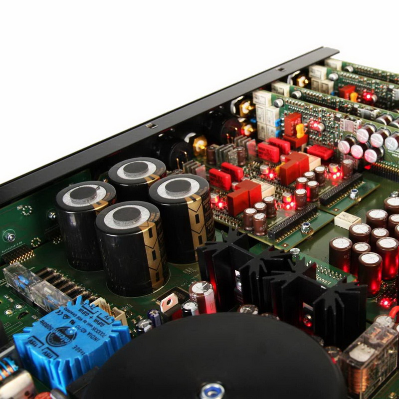 Блок питания два тороидальных трансформатора по 100 ВА каждый, общая емкость конденсаторов: 164000 мкФ
