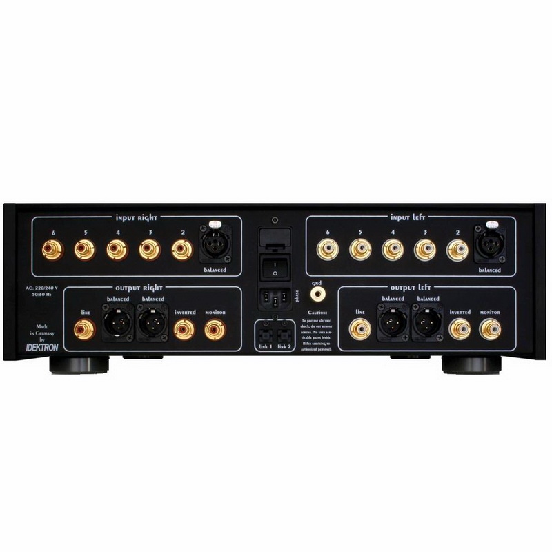 Разъемы для левого и правого каналов разнесены на определенное расстояние в соответствии с конструкцией «двойное моно». Входы: балансный XLR, 5 линейных RCA. Выходы: 2 балансных XLR, линейный RCA, линейный инвертированный RCA и мониторный RCA для записи. Есть разъем для заземления и пара оптических выходов системной шины. Для управления имеется штатный ПДУ.