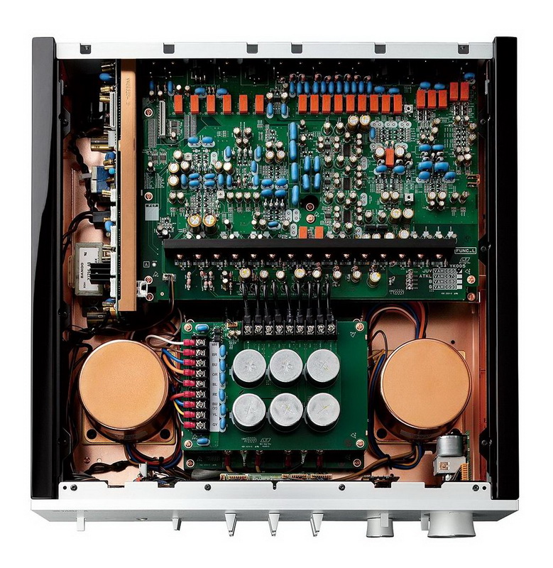 Конструкция в виде "разворота книги" для печатной платы предусилителя предусматривает зеркальные пути сигнала левого и правого канала, чтобы обеспечить точное сочетание и соответствие их характеристик. Поскольку оба канала физически идентичны, Yamaha C-5000 может наиболее точно воспроизвести ширину и глубину звучания. Кроме того, при подключении других компонентов гул от паразитного заземления сводится к минимуму.