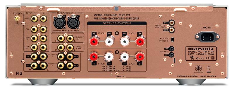 Усилитель оснащен тремя линейными небалансными входами, балансным входом, входами/выходами для двух записывающих устройств, и выходом с предусилителя. К Marantz PM-11 S3 можно подключить две пары акустических систем, а на его передней панели имеется выход для стереотелефонов. Аппарат выполнен на омедненном шасси, надежно защищающем его электронные схемы от внешних электрических помех и механических вибраций.