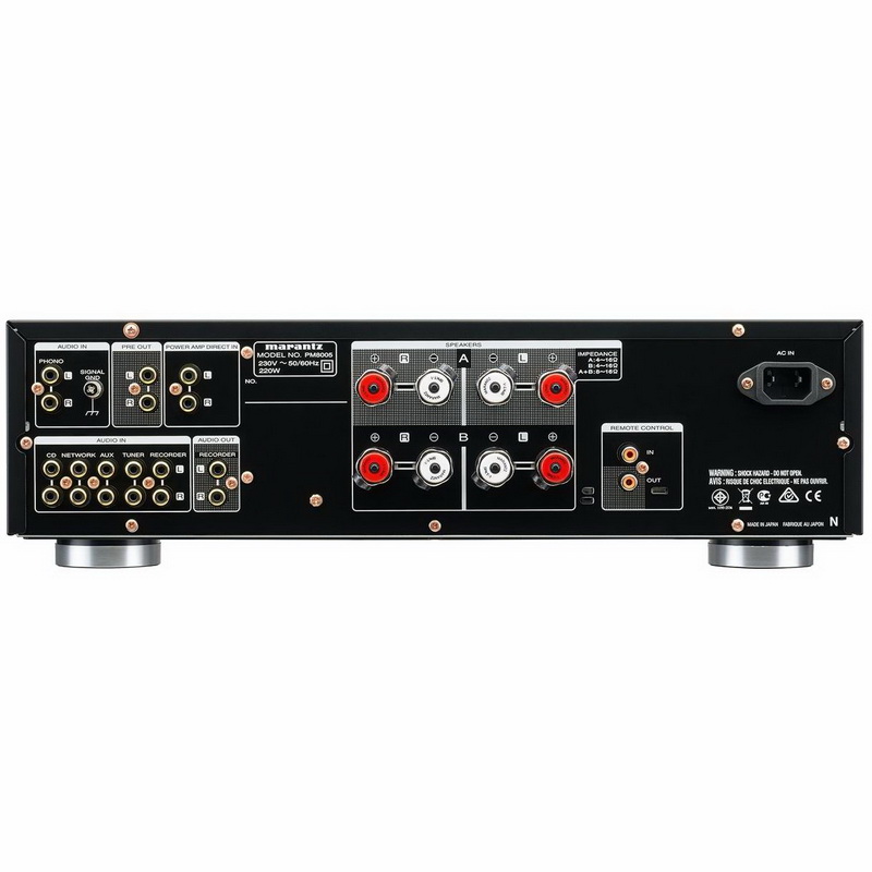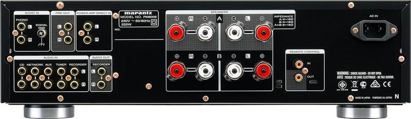 Усилитель Marantz PM8005 оснащен удобными фирменными клеммами SPKR-100 для подключения колонок, импеданс которых может находиться в диапазоне от 4 до 16 Ом. Также к Marantz PM8005 можно подсоединить наушники с разъемом диаметром 6,3 мм.