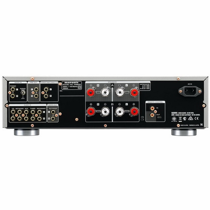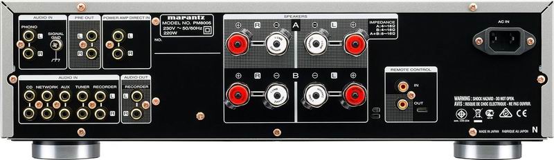 Усилитель Marantz PM8005 оснащен удобными фирменными клеммами SPKR-100 для подключения колонок, импеданс которых может находиться в диапазоне от 4 до 16 Ом. Также к Marantz PM8005 можно подсоединить наушники с разъемом диаметром 6,3 мм.