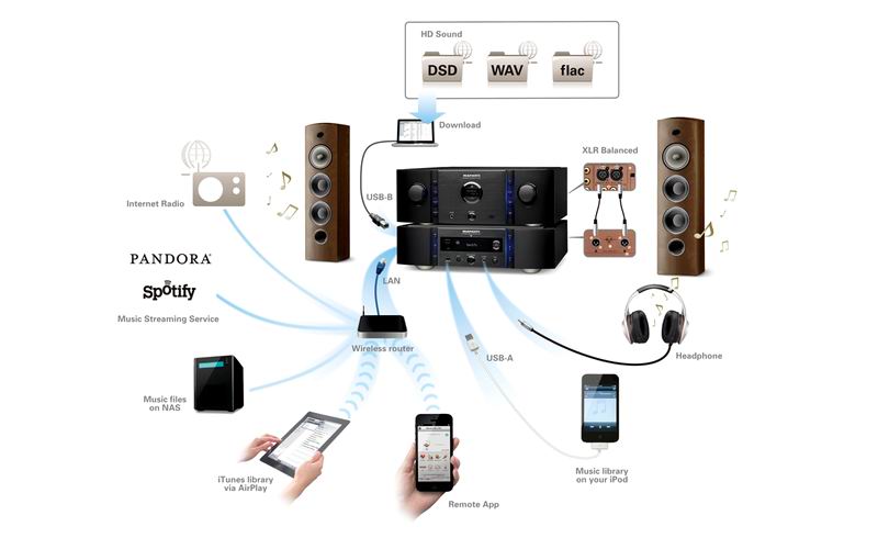 Плеер выдаёт столь захватывающее дух качество звука, поскольку содержит ЦАП, который придётся по вкусу аудиофилам, а также оригинальный DSP процессор и цифровой фильтр PEC777 Marantz — высококлассный алгоритм, прежде применявшийся только в профессиональных студиях звукозаписи. Это обеспечивает более насыщенную детализацию, гораздо более широкую звуковую сцену и совершенный баланс. Аналоговые аудио схемы содержат модули Marantz HDAM-SA2 и HDAM, тороидальный трансформатор выдаёт питание в нужное мгновение, а жёсткое шасси с медным покрытием и верхней алюминиевой крышкой толщиной 5 мм снижает вибрацию. Выбираемые владельцем цифровые фильтры настраивают звук по его вкусу. Порт USB-B, работающий в асинхронном режиме, принимает 192 кГц/24 бит. Воспроизводите файлы форматов FLAC 192/24, WAV 192/24, Интернет-радио, используйте потоковую передачу данных через Ethernet или слушайте музыку по AirPlay в с iTunes или iDevices. Поскольку плеер имеет сертификат DLNA 1.5, интеграция с Android осуществляется без труда, а порт USB-A на передней панели обеспечивает воспроизведение музыки с устройств iPod/iPhone/iPad или USB накопителей.