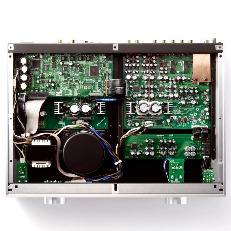 Входы: четыре линейных RCA (включая разъемы для мониторинга записи), разъемы MM-фонокорректора, балансный AES/EBU (XLR), по два коаксиальных и оптических, USB-порт (с чипом C-Media CM6631), который работает в асинхронном режиме при установке на ПК соответствующего драйвера и может принимать файлы в разрешении 32 бит/192 кГц. Выходы: оптический, RCA для записи и пара Pre Out (RCA). С помощью последних можно организовать би-ампинговое подключение. Возможно создание сквозного канала при подключении источника к входу Line 2 и переводе выходов предусилителя в фиксированный режим, что удобно при работе в системы ДК. Есть гнездо RI для управления фирменной док-станцией Onkyo Dock и триггерный выход (12 В).