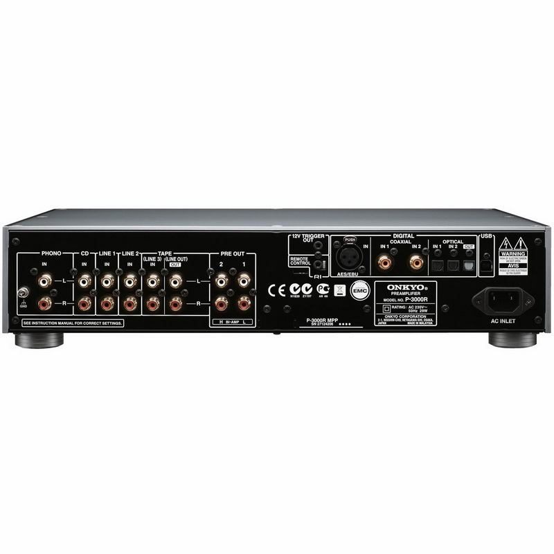 На сегодняшний день самый серьёзный тракт для работы с шиной USB, пожалуй, реализован у Onkyo P-3000R. Японские инженеры взяли за основу двухканальный предварительный усилитель аудиофильского класса и дополнили его самым совершенным трактом на двойном 32-битовом ЦАПе Burr-Brown. Цифровая и аналоговая секции, разумеется, получают питание от разных стабилизаторов. Первая, помимо USB, имеет и другие входы, в т.ч. даже AES/EBU, и потому позволяет подключать любой цифровой источник. Аналоговая секция наделена коммутатором на четыре RCA-входа, встроенным RIAA-корректором, темброблоком, выходом на магнитофон, регулируемым Preout и балансным выходом на оконечный усилитель. Второй особенностью P-3000R является возможность деления сигнала на частотные полосы для реализации bi-amping.