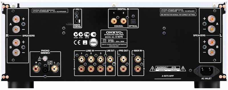 Интегрированный MM/MC фонокорректор позволяет без труда подключить к усилителю виниловый проигрыватель, а встроенный независимый усилитель для наушников дает возможность наслаждаться высококачественным звуком, не мешая при этом окружающим. На задней панели усилителя установлены 3 пары аналоговых входов и 1 пара аналоговых выходов. 4 пары винтовых акустических клемм позволяют подключать 2 комплекта стереоакустики или использовать технологию Bi-wire для подключения одного комплекта. Кнопки управления дополнительными функциями усилителя спрятаны за крышкой на передней панели. Onkyo A-9070 поставляется в черном или серебристом цветах.