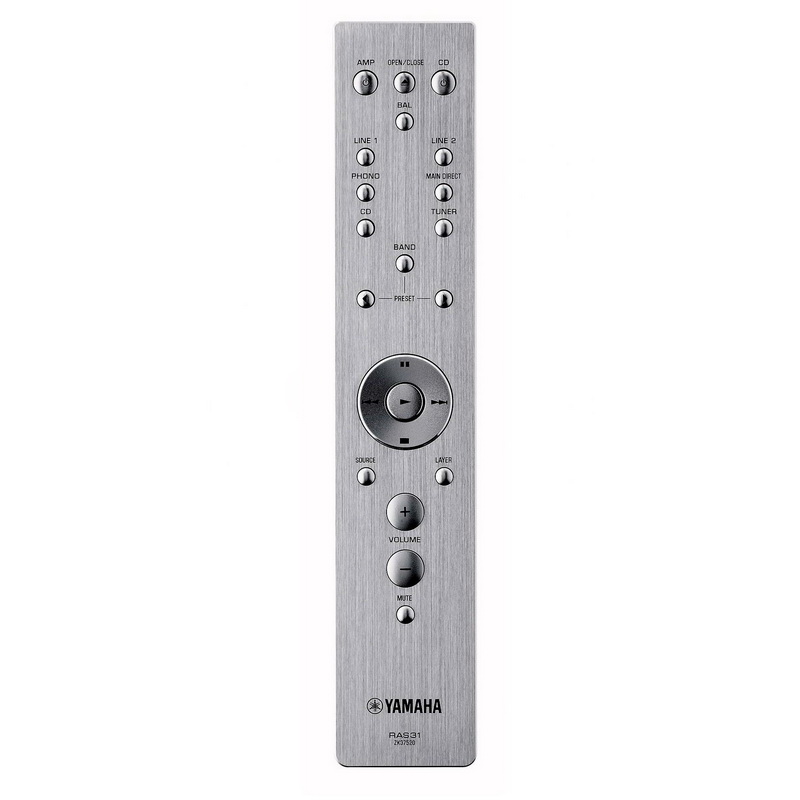 Прилагаемый пульт ДУ сделан в том же стиле, что и алюминиевая панель усилителя — простой дизайн, интуитивно понятное расположение кнопок, приятная металлическая текстура. Пульт позволяет не только регулировать громкость и переключать входы на усилителе Yamaha А-S2100, но также может быть использован для управления CD-проигрывателем Yamaha CD-S2100.