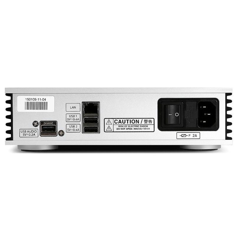 Устройство оснащено парой USB-входов для внешних накопителей, а также специальным экранированным асинхронным выходом USB с продуманной схемой питания, гарантирующей минимум шумов. Данный выход работает с такими Hi-Res-форматами, как DSD64/DSD128 (DoP) и PCM в разрешении, соответствующем тому, которое поддерживает подключенный к Aurender N100H внешний цифро-аналоговый преобразователь. Для ЦАПов без USB-порта в проигрывателе предусмотрен коаксиальный разъем. Подключиться к локальной сети и серверам NAS, а также получить обновление софта можно через гигабитный LAN-интерфейс.