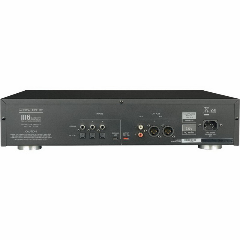 Внешний цифро аналоговый преобразователь Musical Fidelity M6S DAC построен на чипах, способных работать с PCM-сигналами до 32 бит/768 кГц, и осуществляет пересинхронизацию данных для уменьшения джиттера. Musical Fidelity M6S DAC поддерживает DSD64/128. Все входные PCM-потоки подвергаются апсэмплингу до максимального разрешения чипа, то есть до 32 бит/768 кГц. ЦАП оснащён тремя коаксиальными и тремя оптическими входами, а также интерфейсом USB для подключения к компьютеру.