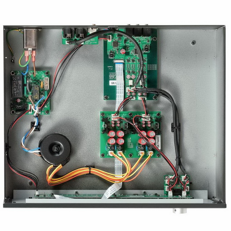 Схема построена по топологии двойное моно и является полностью балансной, для этого задействовано четыре 32-битных стереофонических ЦАПов. Блок питания — стабилизированный с цифровым регулятором напряжения. Уровень искажений на частоте 20 кГц всего 0,0004%, а соотношение сигнал/шум не хуже 119 дБ. Аппарат оснащен встроенным высококачественным усилителем для наушников. Балансные и небалансные выходы могут работать как в линейном, так и в регулируемом режиме, что позволяет использовать ЦАП с активной акустикой или усилителями мощности напрямую.