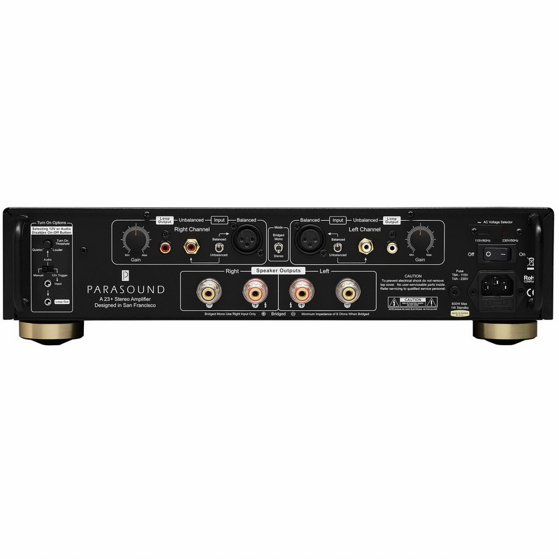 Усилитель мощности Parasound A 23+ представляет собой более мощный вариант предыдущей модели A 23. Новинка также получила новый трансформатор мощностью 1,1 кВА и набор конденсаторов емкостью 54 400 мкФ. Теперь максимальная мощность усилителя в мостовом режиме достигает 500 Ватт. Как и старшая модель, A23+ оборудована симметричными и несимметричными входными терминалами с регулировкой чувствительности для лучшего согласования с предварительным усилителем. Весит Parasound Halo A23+ ровно 12,2 килограмма. Усилитель Parasound A 23+ выстроен согласно фирменной концепции, заложенной разработчиками ещё в восьмидесятых годах, получившей название Direct Coupled.