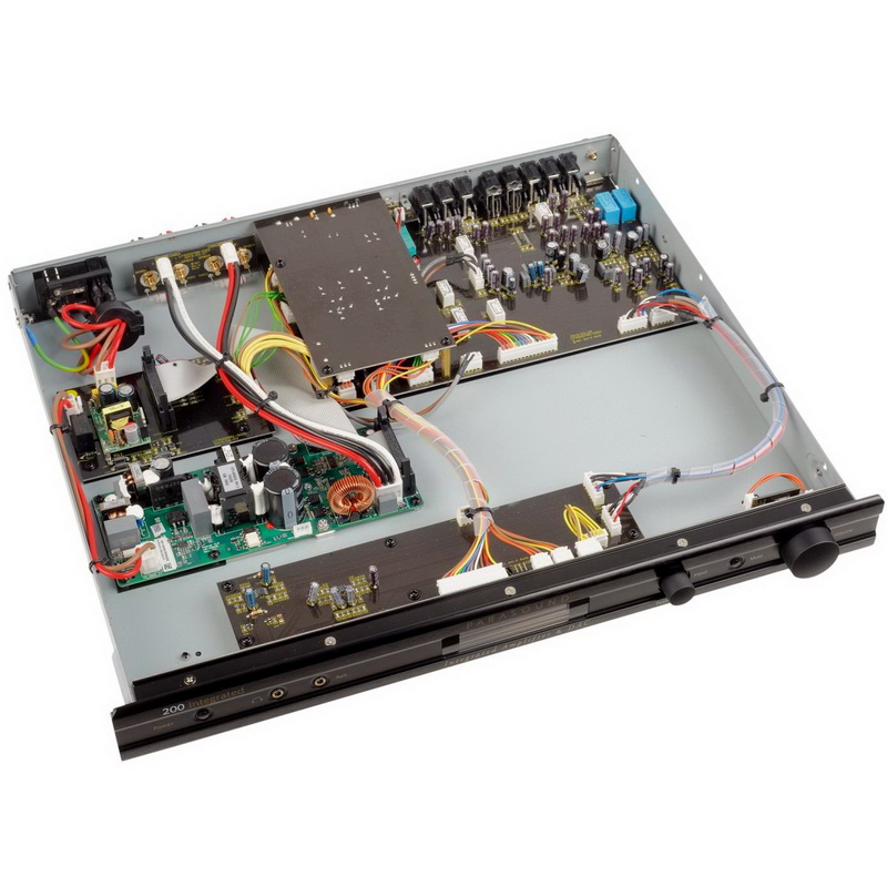 Усилитель мощности в 200 Integrated построен на импульсных модулях производства Pascal. Усилительные блоки этого небезызвестного датского разработчика очень уважают и создатели профессиональной активной акустики, и серьезные аудиофильские бренды. К примеру, помимо Parasound их используют Mytek и Focal.