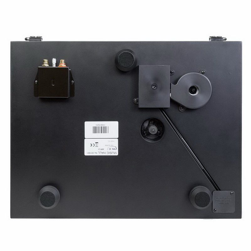 В обширной линейке LP-проигрывателей компании Music Hall представленный MMF 2.3 — самый «младший». Модели выпускаются на заводе в Чехии, который имеет опыт их производства еще со времен Варшавского договора и где также изготавливаются LP-проигрыватели под маркой Pro-Ject. Проигрыватель, как и принято для сложной механики, поставляется в частично разобранном состоянии, но его сборка благодаря подробной инструкции превращается в дополнительный источник положительных эмоций. Проигрыватель имеет двойной диск: нижний с меньшим диаметром служит для передачи вращения от электродвигателя (ось этого диска из нержавеющей стали опирается на бронзовый подшипник), а верхний с фетровым матом — для установки пластинки.