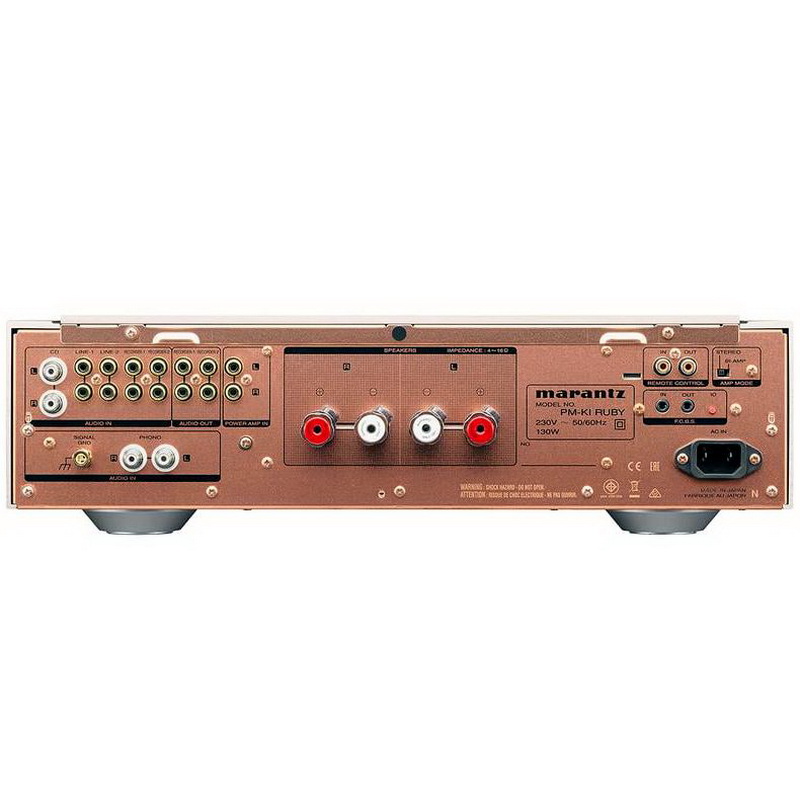 Усилитель оснащен тремя линейными небалансными входами, балансным входом, входами/выходами для двух записывающих устройств, и выходом с предусилителя. К усилителю Marantz PM-KI Ruby можно подключить одну пару акустических систем, а на его передней панели имеется выход для стереотелефонов. Аппарат выполнен на омедненном шасси, надежно защищающем его электронные схемы от внешних электрических помех и механических вибраций.