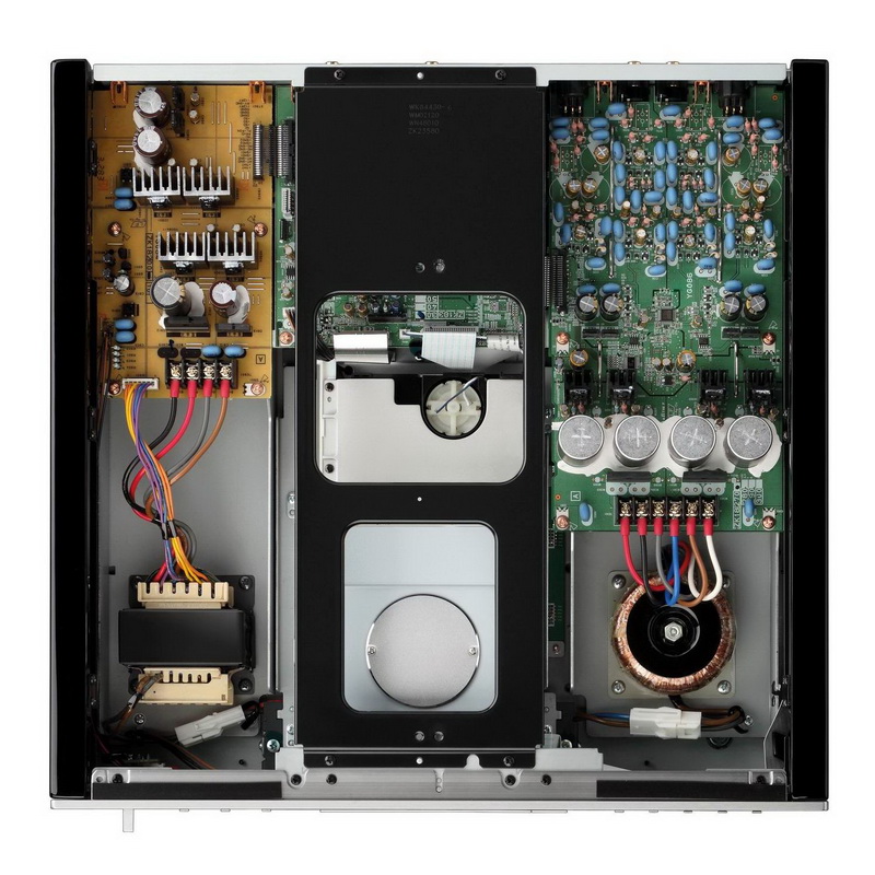 Yamaha CD-S2100 имеет полностью симметричную конструкцию: вращающийся механизм погрузчик находится в центре, цифровой блок питания и плата находятся на левой стороне, а блок питания и платы находятся справа. Центральная рама, которая простирается от передней к задней части проигрывателя и передняя панель изготовленны из 5мм (1/4 ") толщины алюминия, увеличивает жесткость всего шасси и обеспечивает стабильную работу дисковода. Ц / А преобразователь для компакт является ES9016 от ESS Technology, Inc Мы выбрали это после тщательного изучения всех точек-не только его высокой точности обработки 32-битного звука, но и возможностью обрабатывать большие объемы аудиоданных.