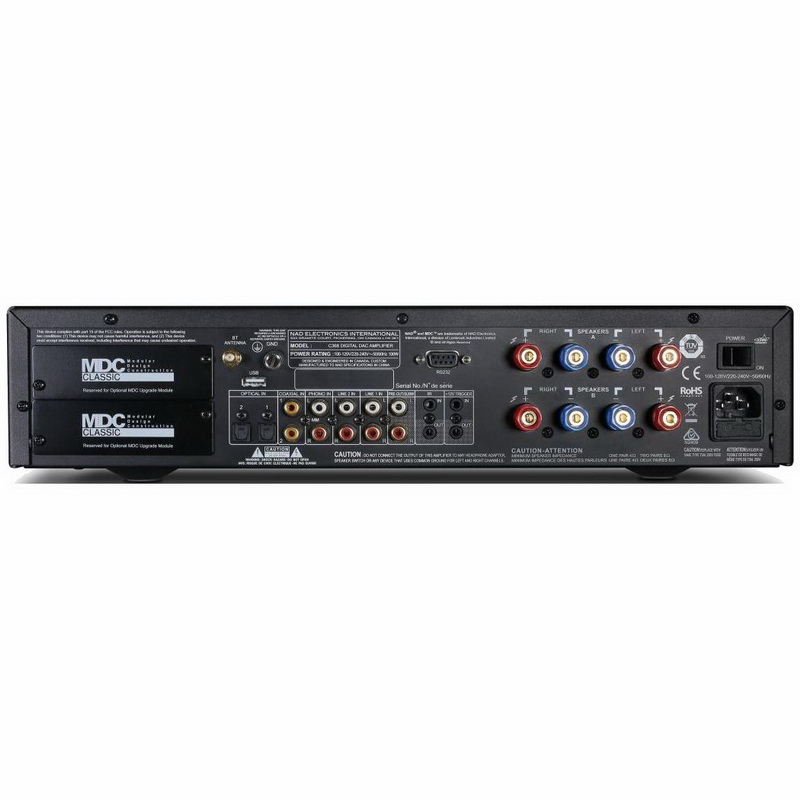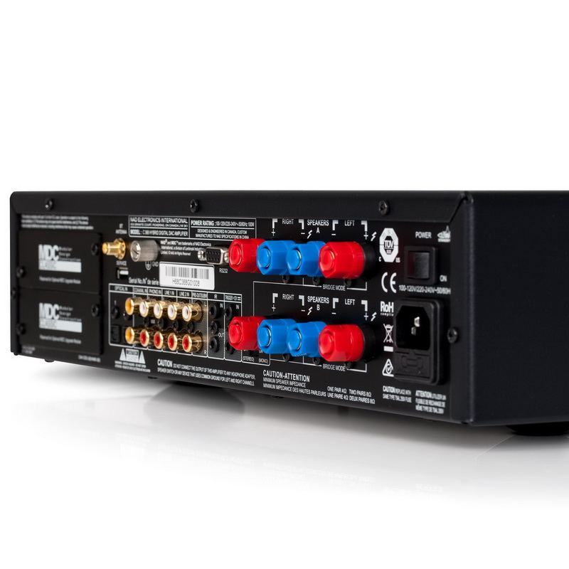 Несколько лет назад компания NAD начала продвигать идею модульного дизайна в своей аппаратуре. Обычно она оказывается не слишком популярной – покупатели не очень заинтересованы в том, чтобы возвращаться в магазин для «прокачки» купленной техники – но в случае с NAD она оказалась успешной. В усилителе NAD C 368 применена модульная конструкция и аппарат оснащен двумя съемными панелями, на место которых могут быть установлены опциональные модули. Один из них называется DD HDMI 1. Он оснащен тремя HDMI-входами и одним выходом, и позволяет C 368 коммутировать видеосигнал. К сожалению, предусмотрена возможность работы только с видео с разрешением не выше 1080p, и поддерживается только стереозвук.