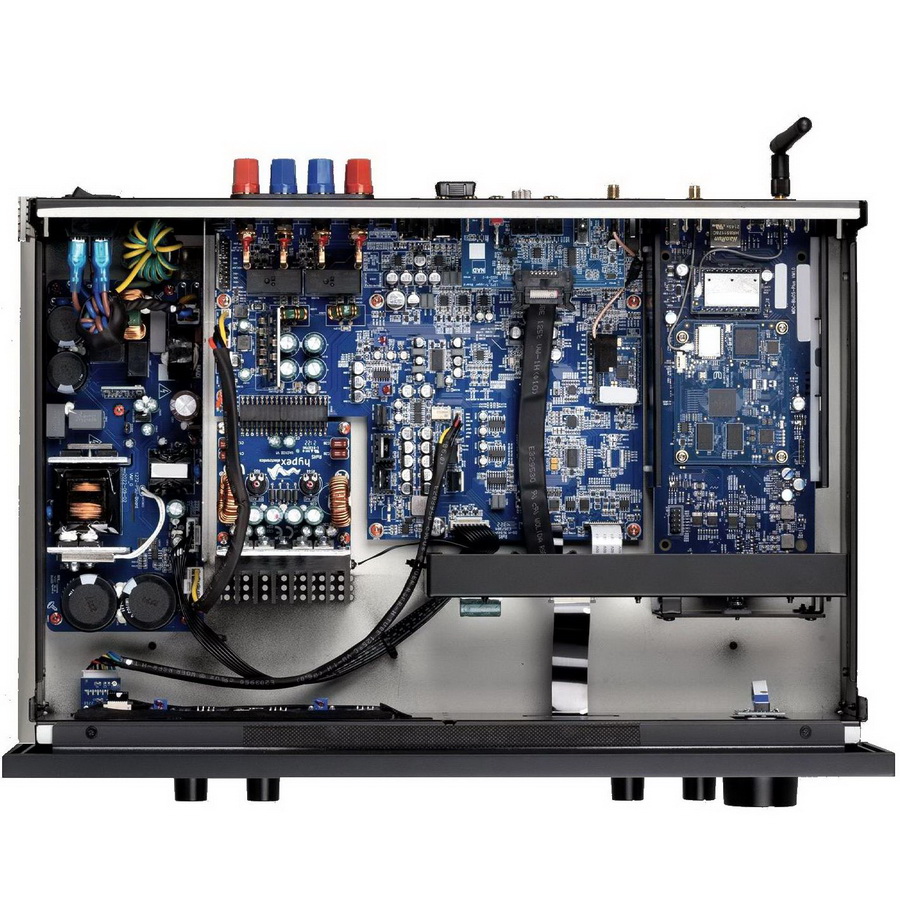 Там всё строго по современным стандартам. Используется большая плата блока питания, которую NAD не закупает, а производит сама. Однако сам усилитель мощности класса D , как и в случае с C 700, поставляется голландским специалистом по импульсным усилителям Hypex. Теоретически его выход можно напрямую подключить к акустическим системам без каких-либо дополнительных компонентов . В модели 3050 же он подключается к материнской плате – опять же, собственной разработки NAD.