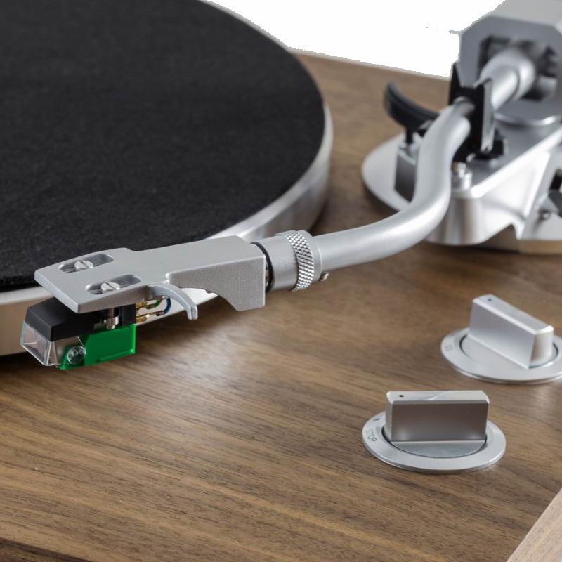 Отдельно хочется сказать об управлении. Оно сделано удобно и изящно. На корпусе TEAC TN-400BT имеются две поворотные ручки, кстати, очень похоже, что сделанные из алюминия. Одна отвечает за включение-выключение мотора, вторая за переключение скоростей между 33,3 и 45 оборотами в минуту. И отдельно хочется похвалить разработчиков за отсутствие всевозможной бесполезной индикации, во всей конструкции проигрывателя только один неяркий светодиод, рядом с ручкой управления мотором, около положения «Play».Тонарм не предусматривает замены или апгрейда, впрочем для бюджетного сегмента такая возможность была бы странной. Сам тонарм выглядит весьма неплохо: 9-дюймовый, статически сбалансированный, с классической поворотной конструкцией, привычным съемным шеллом и удобным ручным микролифтом. Шелл позволяет настраивать положение головки — в основании крепления разъема для шелла есть фиксирующий винт, ослабив который можно чуть-чуть скорректировать значение азимута.Противовес у тонарма полноценный — съемный, регулируемый, с поворотной шкалой с градуировкой прижимной силы — в базовом варианта настроить тонарм по паспортной точности не составит труда, а дальше можно подстроить нюансы на слух, хотя штатная головка терпимо относится к небольшим погрешностям настройки. Разве что антискейтинг по нанесенной на регулировочную ручку шкале, за счет очень малого шага, настраивается довольно грубо, но в пределах погрешности для установленной головки — ничего страшного не произойдет, что показала в том числе и проверка по тестовым дискам. Единственное, чего тонарм не позволяет, так это настраивать высоту. Но учитывая тот факт, что все сделано изначально для корректной работы штатного, предустановленного на заводе картриджа Audio-Technica AT95E особых проблем в будущем возникнуть не должно — поменять иглу у головки проще простого, да и подобрать что-то другое подходящее из семейства Audio-Technica тоже вполне реально.