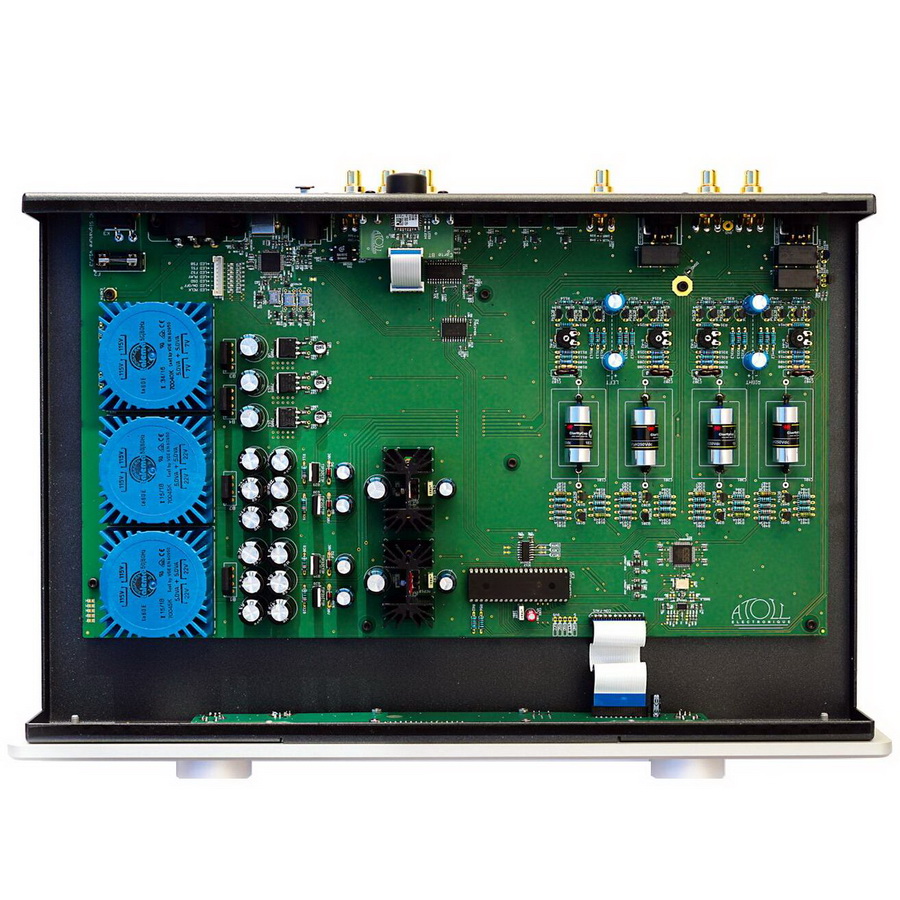 Модель Atoll DAC 300 получила полностью симметричную топологию схем, двенадцать регуляторов напряжения и два малошумных силовых трансформатора для питания выходной секции, в которой установлены дискретные элементы. В цепях задействованы тщательно подобранные комплектующие высокого класса, в том числе высококачественные конденсаторы MKP и слюдяные конденсаторы с металлизированными серебром обкладками. В выходном каскаде не используется обратная связь (каскад работает в классе A), благодаря чему удается минимизировать искажения.
