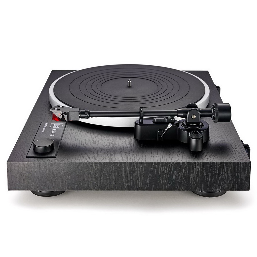 Подшипник диска состоит из оси из закаленной стали и латунного корпуса. Высокая точность изготовления узлов подшипника гарантирует отсутствие шумов при прослушивании пластинки. Dual CS 418 оснащен прямым статически сбалансированным тонармом с алюминиевой трубкой и стандартным шеллом. Для перемещения тонарма используется демпфированный микролифт. На модели штатно смонтирован MM-звукосниматель Ortofon 2M Red, отличающийся детальным и сбалансированным звучанием. В проигрывателе есть встроенный фонокорректор, что позволяет подключать его напрямую к линейным входам интегральных усилителей или AV-ресиверов. В то же время встроенный корректор можно отключить, и снять сигнал непосредственно с картриджа.