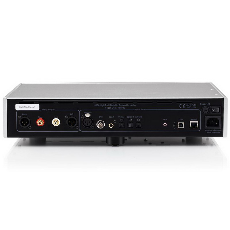 Для перевода «цифры» в «аналог» в Hegel HD30 используются два чипа AK4490EQ (по одному на канал), а в роли преобразователя частоты квантования выступает чип AK4137EQ. Отдельного внимания заслуживает новый высокоэффективный тактовый генератор. БП флагмана оснащен парой тороидальных трансформаторов для раздельного питания цифровых и аналоговых цепей, а также конденсаторами общей емкостью в 54 000 мкФ. В выходной аналоговой секции применяется технология SoundEngine, благодаря которой в топологии схем используется прямая связь вместо обратной связи. В итоге удается существенно понизить искажения. Отношение сигнал/шум модели составляет 150 дБ, а коэффициент искажений не превышает 0,0005%.