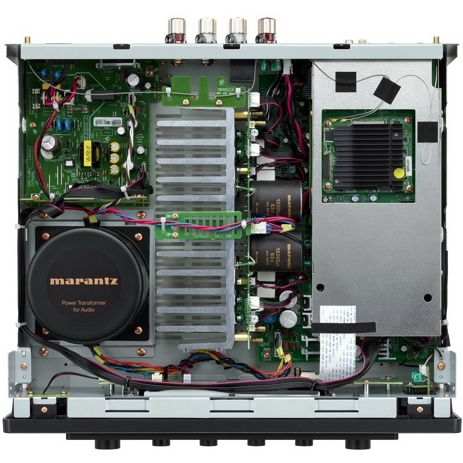 В итоге, согласно информации производителя, обеспечивается более динамичный, точный и детальный саунд. В тщательно проработанном сильноточном блоке питания Marantz Model 60N установлен экранированный тороидальный трансформатор и пара высокоемкостных конденсаторов (каждый по 15000 мкФ). При этом обеспечивается мощность в 60 Вт при нагрузке в 8 Ом. Цепи модели оснащены качественными аудиофильскими комплектующими, а для охлаждения применяются радиаторы, изготовленные из алюминия.