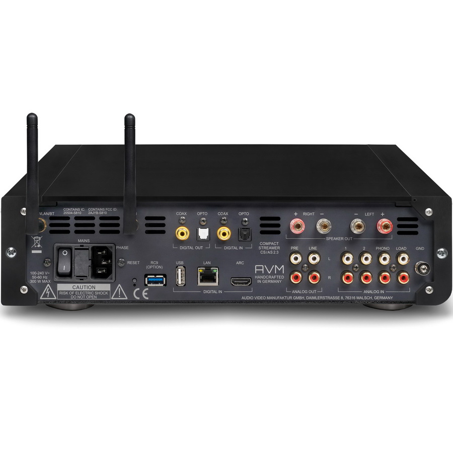 AVM Audio Inspiration AS 2.3 получает данные либо по кабелю Ethernet, либо через WLAN. Смартфоны также можно подключить к устройству через Bluetooth. Дополнительные внешние устройства-источники также можно подключить к задней панели. Это работает либо через коаксиальное, либо через оптическое соединение. Однако существующий порт HDMI с поддержкой ARC идеально подходит для интеграции телевизора в систему. И последнее, но не менее важное: USB-накопители также можно подключать и читать. Такой хороший, такой цифровой. Но AVM также предлагает множество аналоговых возможностей. Два набора разъемов RCA позволяют подключать дополнительные устройства. Третья пара соединений затем используется для использования проигрывателя. Высококачественный фонокорректор AVM Audio Inspiration AS 2.3 может использоваться с картриджными системами MM и MC и позволяет регулировать импеданс. В комплект входят три комплекта подходящих адаптеров, которые подключаются к разъему «Load» непосредственно рядом с фоно-входом.